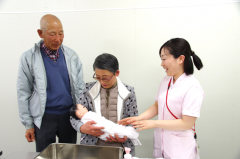 小児科医師からは、今と昔の育児の違いなど子育て全般について、助産師からは、発熱時などの対応やスキンケア、母乳育児、実際にどのようなサポートが必要かをお話しし、抱っこの仕方やお風呂の入れ方については人形を使用して演習を行っています。