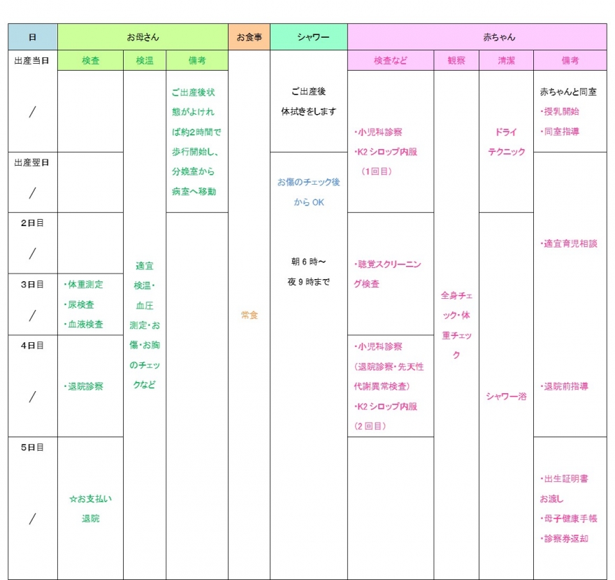 - お母さま、赤ちゃんの経過に問題がなければ、出産後4日目に退院することも可能です。ご相談ください。