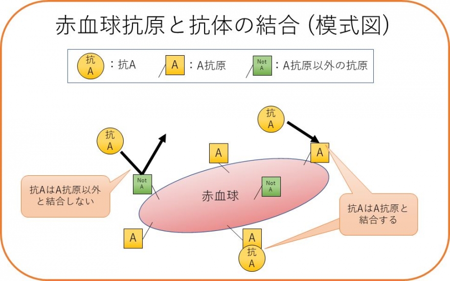 抗原は自身と結合する「抗体」と呼ばれる物質を持ちます。抗体は特定の抗原とのみ結合する特徴があります。例えば抗Aと呼ばれる抗体はA抗原と結合する一方で、B抗原などには結合しません。