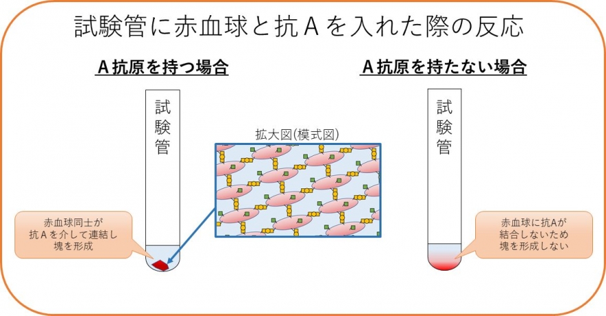 血液型検査では、この抗体を利用することで赤血球の抗原を調べます。例えば赤血球がA抗原を持つかどうかを調べたい場合は、試験管の中に赤血球と抗Aを入れて反応を見ます。赤血球がA抗原を持つ場合は、結合した抗Aを介して多数の赤血球が連結して塊が形成されるので、A抗原の存在を肉眼で観察することができます。