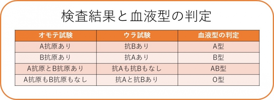 ABO血液型検査ではオモテ試験とウラ試験という2つの検査が行われます。オモテ試験というのは前述した赤血球の「抗原の検査」のことです。ではウラ試験とは何かと言うと、ABO血液型の性質を利用した血液中の「抗体の検査」です。A抗原を持つ人は抗Bを持ち、B抗原を持つ人は抗Aを持つという性質があり、この抗Aと抗Bを調べることで抗原を推測できます。オモテ試験とウラ試験により抗原と抗体をセットで調べることで、ABO血液型をより確実に判定することができます。