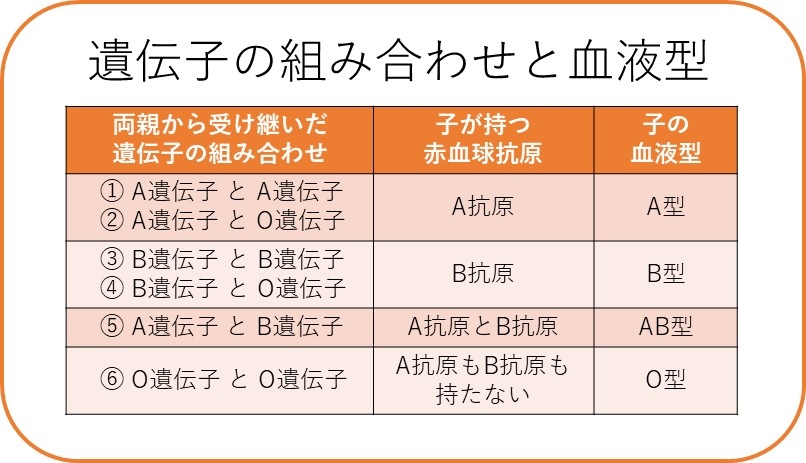 両親ともにO型の場合、子供はO遺伝子以外を受け継ぐ可能性がないため、子供もO型であると推測できます(上表の⑥)。一方で両親がA型とB型の場合、子供はA、B、Oのいずれかの遺伝子を受け継いで②、④、⑤、⑥の組み合わせが考えられるため、すべての血液型になり得ます。