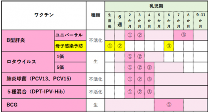 ワクチンを接種すると細菌やウイルスなどの病原体に対する抗体がつくられ、本当の病原体が体の中に入ってきたときに病気にかかるのを防ぐことができます。赤ちゃんはお母さんからもらった抗体によって、多くの病原体の感染から守られていますが、生後5~6ヶ月頃からその抗体が減少し、感染症にかかりやすくなります。生後5~6ヶ月までに予防接種の十分な効果を発揮させるためには、生後2ヶ月から予防接種を開始することが大切です。生後1歳になるまでの小児科学会が推奨する予防接種スケジュールを示しました。